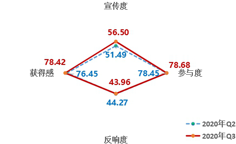 4、從維度來看,反響度小幅下降,宣傳度明顯提升。第三季度,宣傳度得分56.50,參與度得分78.68,反響度得分43.96,獲得感得分78.42。與上一季度相比,除反響度外,其他維度均有上升;其中宣傳度升幅較大。