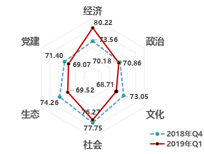 2.從領(lǐng)域來看,經(jīng)濟領(lǐng)域改革熱度一直較高。經(jīng)濟80.22,政治70.18,文化68.71,社會76.27,生態(tài)69.52,黨建69.07。六大領(lǐng)域除經(jīng)濟領(lǐng)域外,政治、文化、社會、生態(tài)、黨建領(lǐng)域均比2018年第4季度有所下降,其中生態(tài)領(lǐng)域下降4.73,降幅6.37%。從連續(xù)八個季度評估結(jié)果來看,相對其它領(lǐng)域,經(jīng)濟領(lǐng)域改革熱度指數(shù)處于高位,社會領(lǐng)域次之,文化領(lǐng)域的改革熱度指數(shù)低位運行。