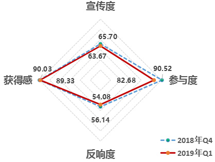 3.從維度來看,反響度呈現(xiàn)上升趨勢。宣傳度63.67,參與度82.68,反響度54.08,獲得感89.33。2019年第1季度,四大維度均比2018年第4季度有所下滑,其中參與度下降達7.84。從連續(xù)八個季度評估結(jié)果來看,反響度在穩(wěn)步提升,說明公眾在積極主動關(guān)注、討論各項改革。