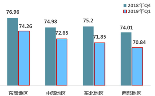 1.從區(qū)域來看,東部地區(qū)高于西部地區(qū)。一季度東部、中部、東北、西部的改革熱度指數(shù)分別為74.26、72.65、71.85、70.84,比2018年第4季度均有所下降。其中,東北地區(qū)的降幅最大,達到4.45%。從連續(xù)八個季度評估結(jié)果來看,改革熱度指數(shù)呈現(xiàn)出地域特征,東部地區(qū)最高,西部地區(qū)最低,兩者之間的差距呈現(xiàn)不斷縮小的趨勢。