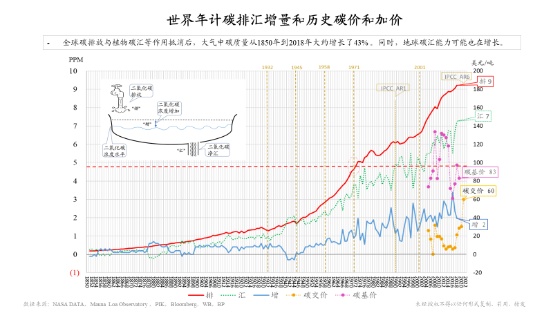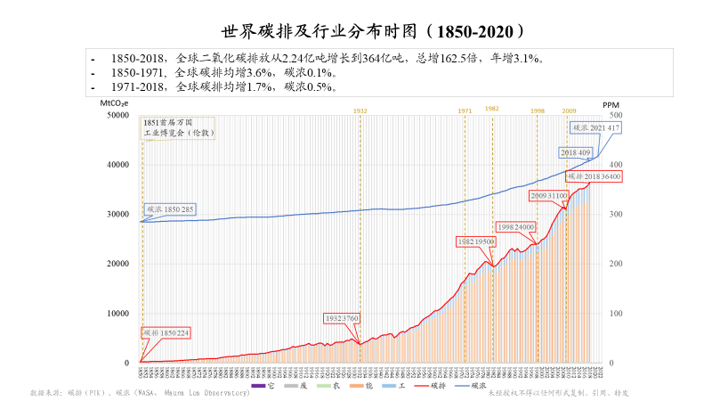 另外,我有兩張圖跟大家分享一下,也是和這個題目相關的。這張圖上面藍線是對我們環(huán)境長期的一個觀測,二氧化碳濃度水平。在夏威夷的莫納羅亞島,從1958年開始有持續(xù)性的觀測,在此之前通過南極冰雪的資料,可以一直追溯到1850年(285PPM)。很有意思1851年全世界第一次工業(yè)博覽會在倫敦召開,也是一個工業(yè)時代到來的標志。經過這么長時間的工業(yè)革命,現(xiàn)在可以看到二氧化碳水平已經達到417PPM。底下這條紅線,是我們自工業(yè)革命以來的全球碳排放,可以看出明顯增速加快。
