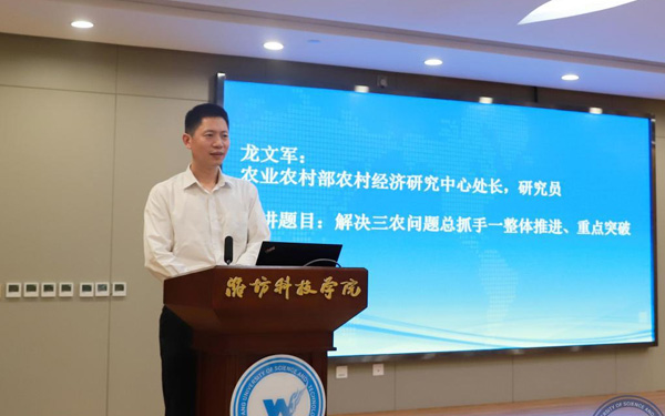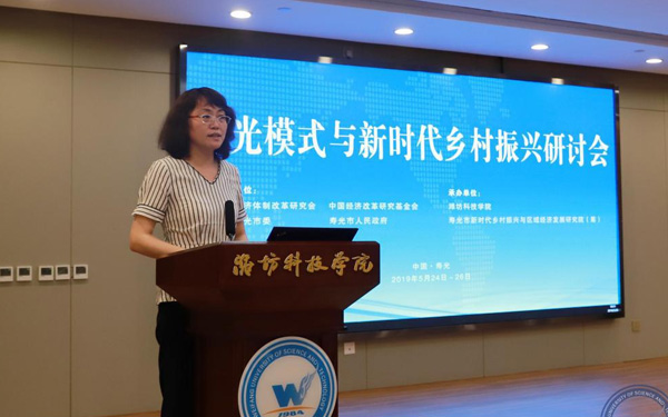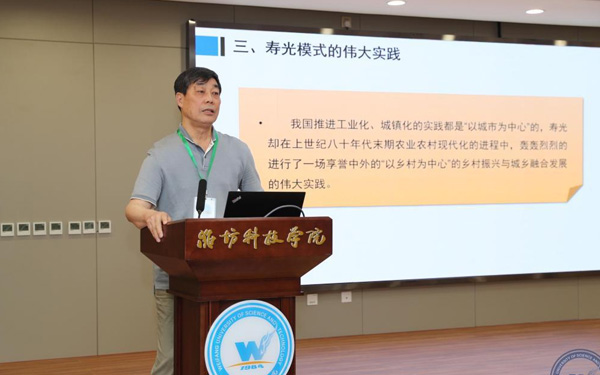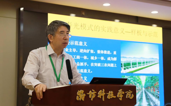 壽光市人大常委會副主任、濰坊科技學(xué)院校長李昌武在致辭中表示,濰坊市委副書記、壽光市委書記林紅玉同志在全市三級干部會議上,對我校提出全面提升辦學(xué)水平,提高社會服務(wù)能力,加快推進(jìn)碩士點(diǎn)培育建設(shè)的要求。為落實(shí)林書記講話要求,加強(qiáng)區(qū)域經(jīng)濟(jì)和“壽光模式”研究,壽光市人民政府與中國經(jīng)濟(jì)體制改革研究會等聯(lián)合成立的“新時(shí)代鄉(xiāng)村振興與區(qū)域經(jīng)濟(jì)發(fā)展研究院”掛靠學(xué)院,引進(jìn)了大批高層次人才,形成了一批富有創(chuàng)造性、建設(shè)性的學(xué)術(shù)研究成果和決策咨詢意見,“壽光模式”研究成果在國家發(fā)改委《改革內(nèi)參》刊發(fā)。成立了國家二級學(xué)會農(nóng)學(xué)思想與《齊民要術(shù)》研究會,連續(xù)成功舉辦了10屆中華農(nóng)圣文化國際研討會,師生原創(chuàng)52集動(dòng)畫片《農(nóng)圣賈思勰》在中央電視臺和山東衛(wèi)視播出。學(xué)校組建了博士、教授農(nóng)學(xué)科研服務(wù)團(tuán)隊(duì),成立了蔬菜產(chǎn)業(yè)學(xué)院、農(nóng)業(yè)技術(shù)培訓(xùn)基地,自主研發(fā)蔬菜品種28個(gè),在全國7個(gè)省區(qū)建立了育種基地,開發(fā)運(yùn)營了壽光市農(nóng)業(yè)智慧監(jiān)管服務(wù)公共平臺,打造了覆蓋設(shè)施農(nóng)業(yè)全產(chǎn)業(yè)鏈的專業(yè)服務(wù)體系,為創(chuàng)新提升“壽光模式”和鄉(xiāng)村振興戰(zhàn)略的實(shí)施提供了有力支撐。