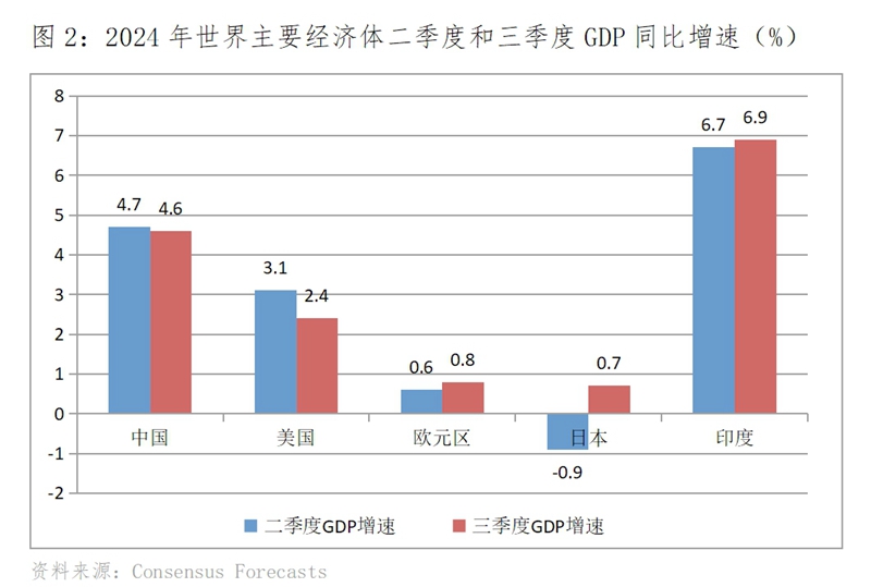 Consensus Forecasts 9月份最新預測,世界主要經(jīng)濟體GDP增速有升有落,呈現(xiàn)出走勢分化的特征。三季度美國GDP同比增長2.4%,比二季度增長3.1%回落0.7個百分點;歐元區(qū)增長0.8%,比二季度增長0.6%回升0.2個百分點;日本增長0.7%,二季度下降0.9%,增速由負轉(zhuǎn)正;印度增長6.9%,比二季度增長6.7%回升0.2個百分點。