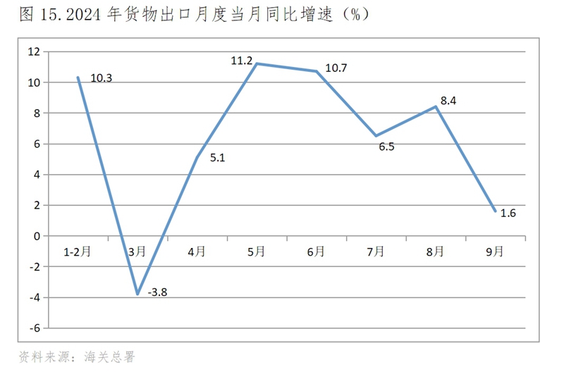 (五)出口增速在較大波動中出現(xiàn)放緩,9月份回落。今年以來的出口增速波動還不小,1-2月份出口同比增長10.3%,3月份下降3.8%,隨后保持了兩個月增速的回升,自6月份增速開始波動回落,到9月份回落到增長1.6%。