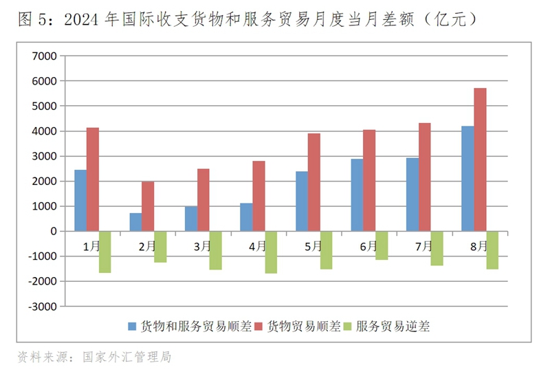 (四)國際收支貨物和服務貿(mào)易順差總體逐月增加,貨物貿(mào)易順差的增加是主因。1月份,國際收支貨物和服務貿(mào)易順差實現(xiàn)了高開,達到了2459億元,2月份回落到724億元,但從2月份開始國際收支貨物和服務貿(mào)易順差逐月增加, 8月份達4203億元,比2月份增加了3479億元。