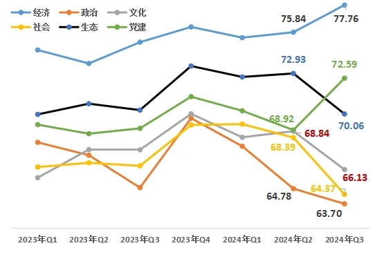 從四大維度來看,宣傳度59.70,參與度79.53,反響度59.94,獲得感80.57。與上一季度相比,宣傳度、反響度提升。同比來看,反映政府主動作為的宣傳度、反映改革效果的反響度和反映改革滿意度的獲得感均保持增長勢頭。