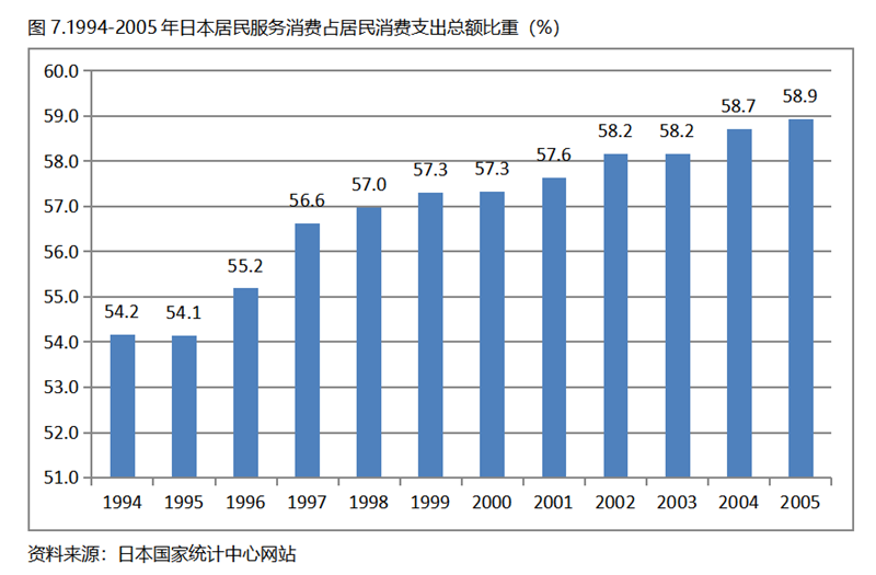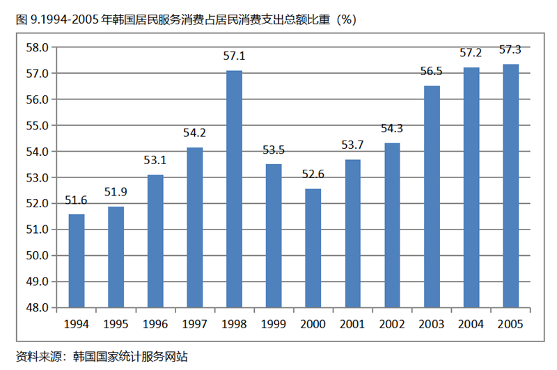 美國、日本和韓國在人均GDP超過1萬美元后,居民服務(wù)消費占居民消費支出總額比重的持續(xù)提高,居民耐用品消費和非耐用品消費占居民消費支出總額比重的總體下降,給出的一個重要啟示,就是提高居民消費率要聚焦在居民服務(wù)消費上發(fā)力。